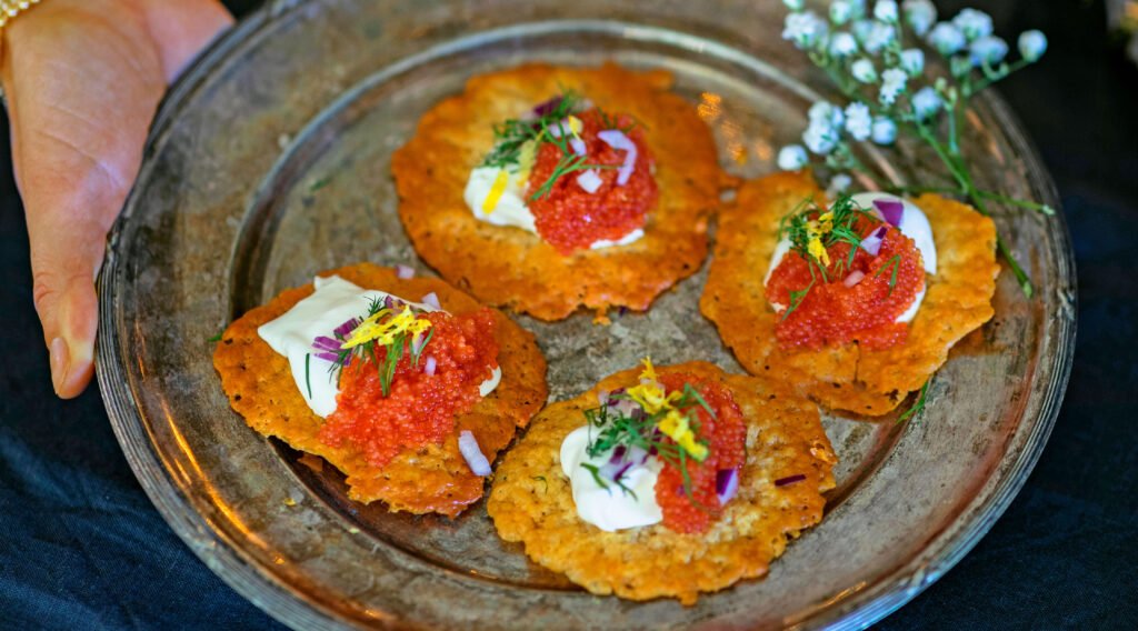 Härligt krispiga parmesanchips toppas här med salt löjrom och fräsch citron. Ett superenkelt tilltugg som imponerar.
