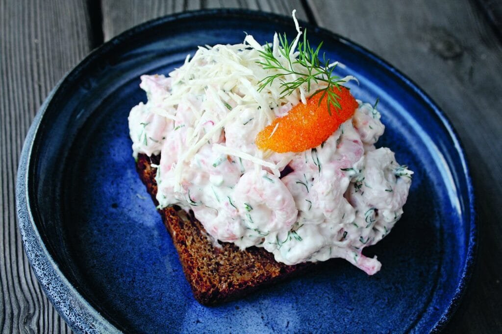 2. Blanda majonnäs med citronjuice och dill, vänd runt räkorna.