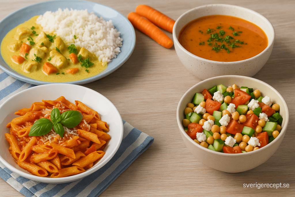 - Välj 5–6 rätter som går att förbereda eller återanvända.